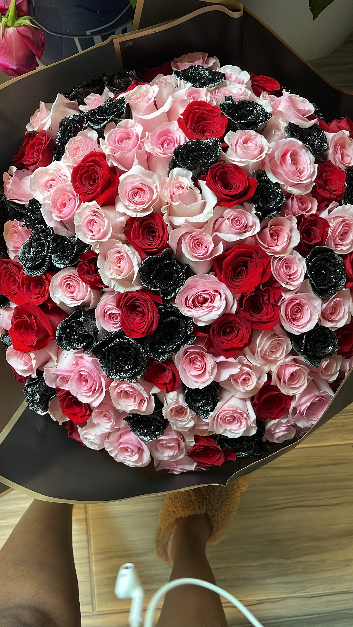 A gorgeous bouquet of Red, Light Pink and Black Glitter Roses.